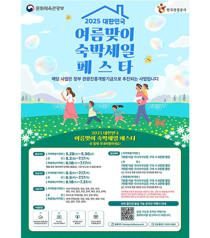 문화체육관광부와 한국관광공사가 여름 휴가철을 맞아 국내여행 장려 및 지역경제 활성화를 위해 ‘2025 대한민국 여름맞이 숙박세일페스타’를 6월 28일부터 본격 추진합니다. 숙박 할인권을 통해 전국 숙소에서 최대 5만 원까지 할인을 받을 수 있어 많은 관심이 예상됩니다.